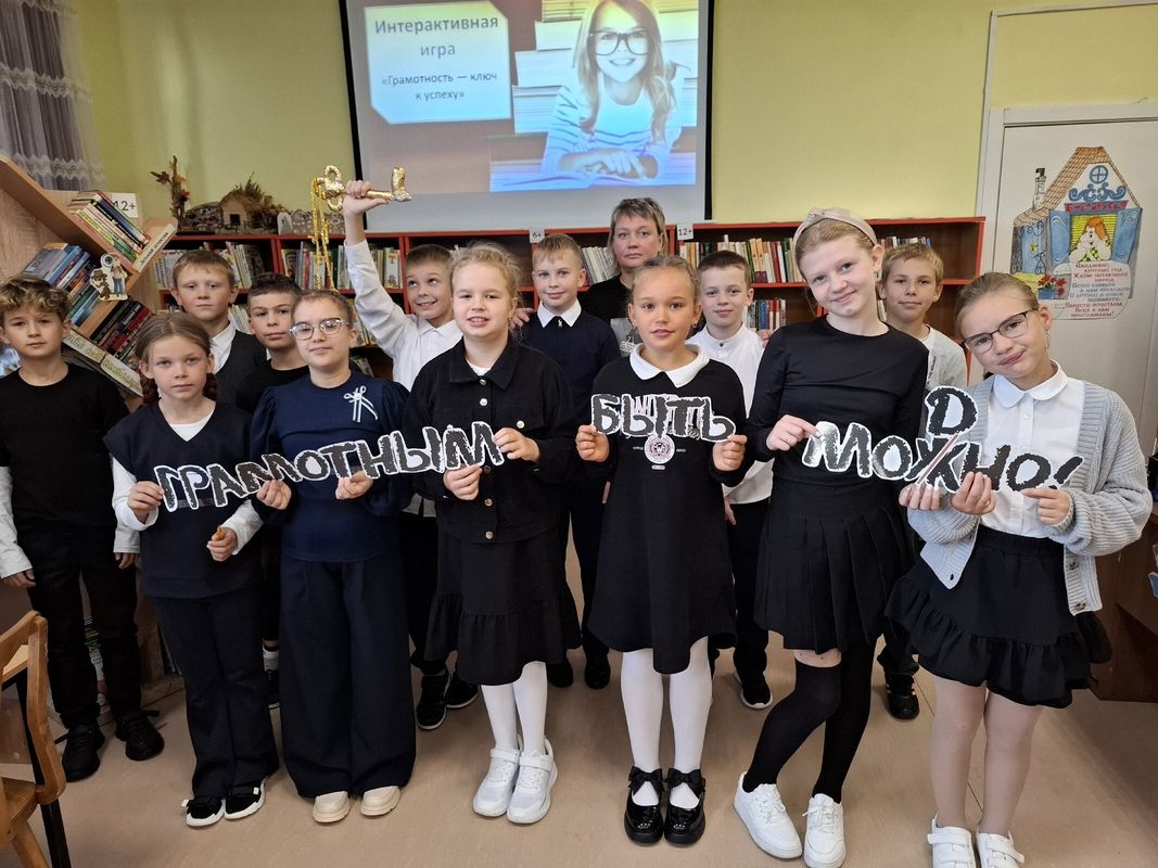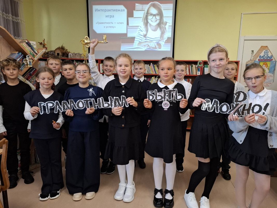 В этот день у ребят 4 класса состоялась интерактивная игра "Грамотность-ключ к успеху", которую провела библиотекарь школы Хамидуллина Е.Н.