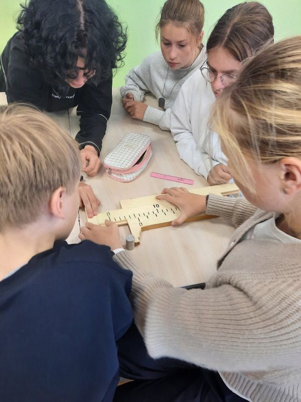 Начались первые лабораторные работы. Семиклассники начали знакомство со штангенциркулем, учились измерять размеры малых тел