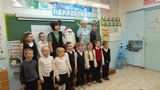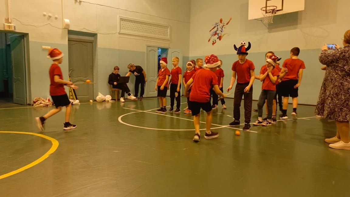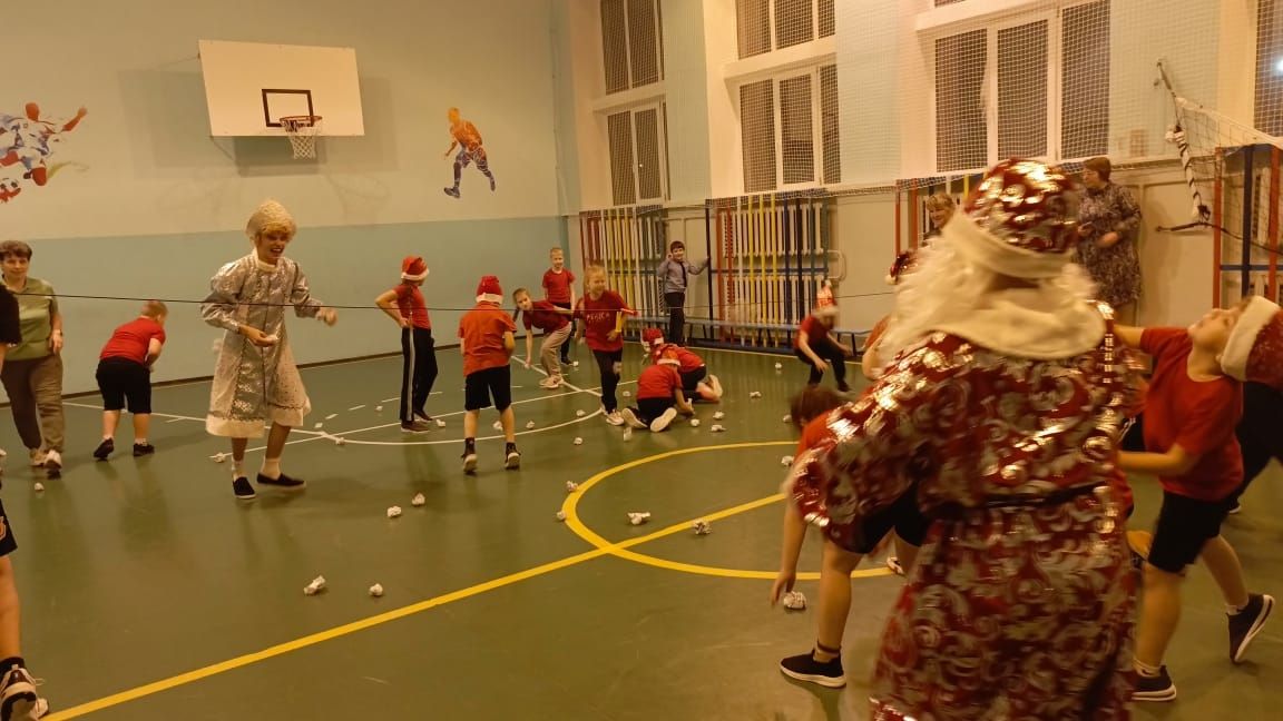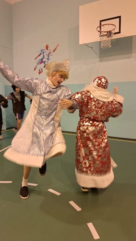 На урок физкультуры во 2 класс пришли неожиданно пришли дед Мороз, Снегурочка и медведь Потапыч, которые провели шуточные эстафеты. Ребята так вжились в роль, что пошли в каждый класс начальной школы и провели небольшую зарядку с малышами. А после, как полагается, фото на память.